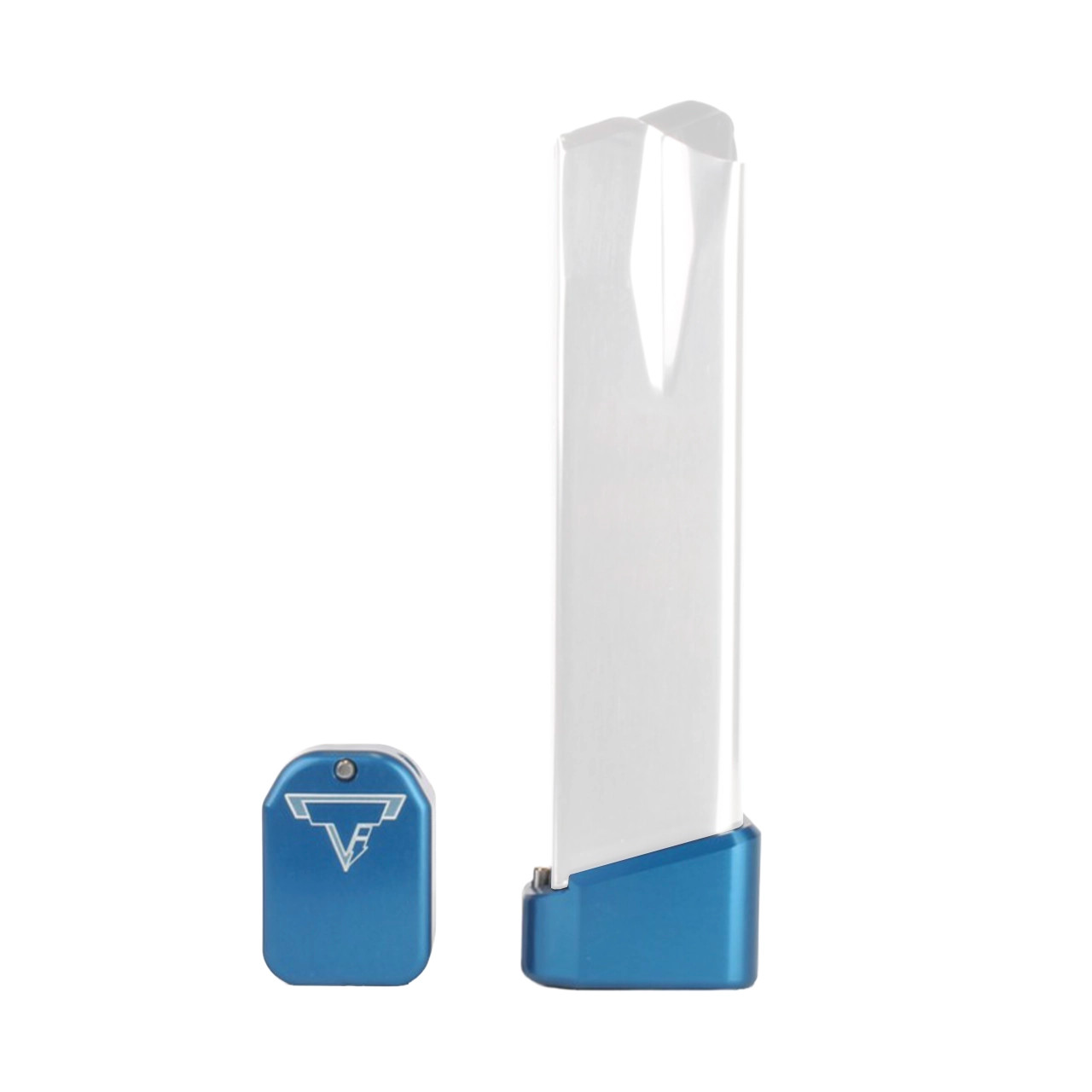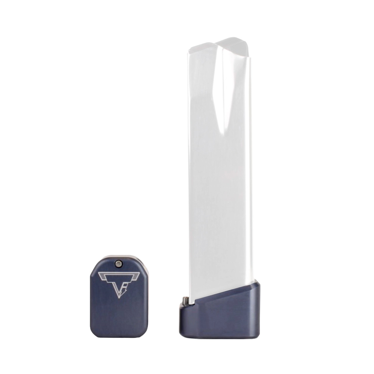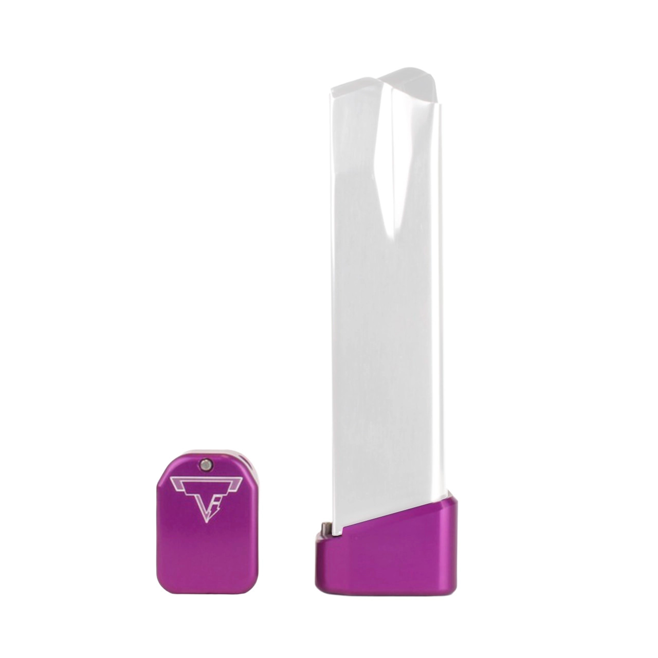 This Taran Tactical Innovations XD(M) base pad works on any 19 ROUND XD(M) magazine. This TTI base pad will add 3 extra rounds in 9mm, and 2 extra rounds in .40 Cal to the magazine. The TTI base pad does add a little extra weight to the magazine which helps the empty mag drop free easier for faster reloads. This XD(M) base pad, just like all of our base pads, is designed to give you the edge over your adversaries. We use our patented push pin design to lock the base pad to the magazine, which makes for easy field stripping and cleaning your magazines between stages. Just push down the pin, slide the base pad on and push the pin up to lock the base pad onto the magazine. Our one piece design is great because there are no extra parts or tools needed to attach the base pad to your magazine. The base pad itself is machined out of billet aluminum and is hard anodized to ensure durable long lasting color. All machining and manufacturing is done in the USA.