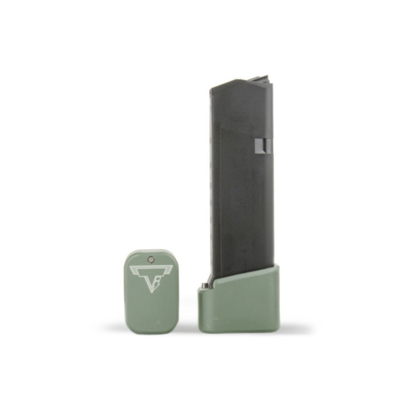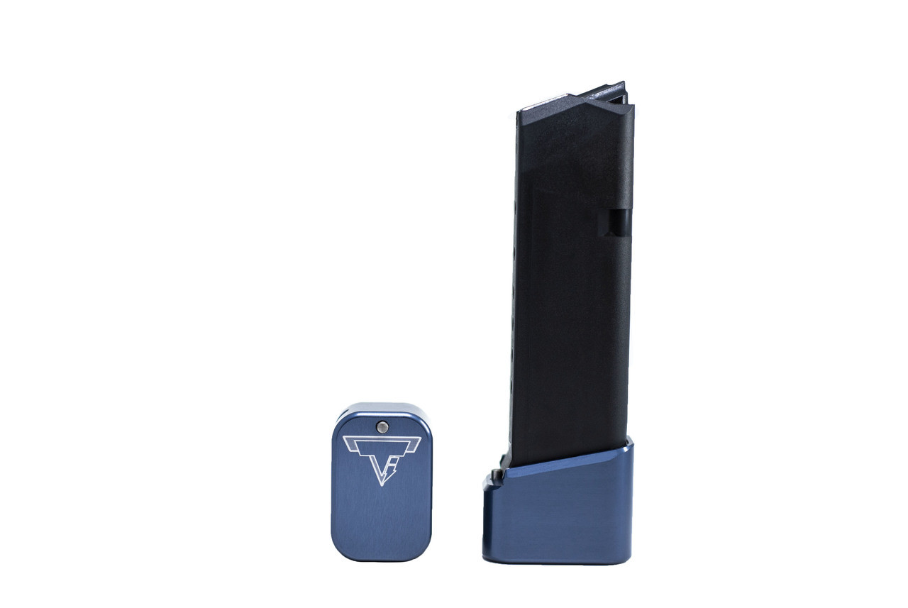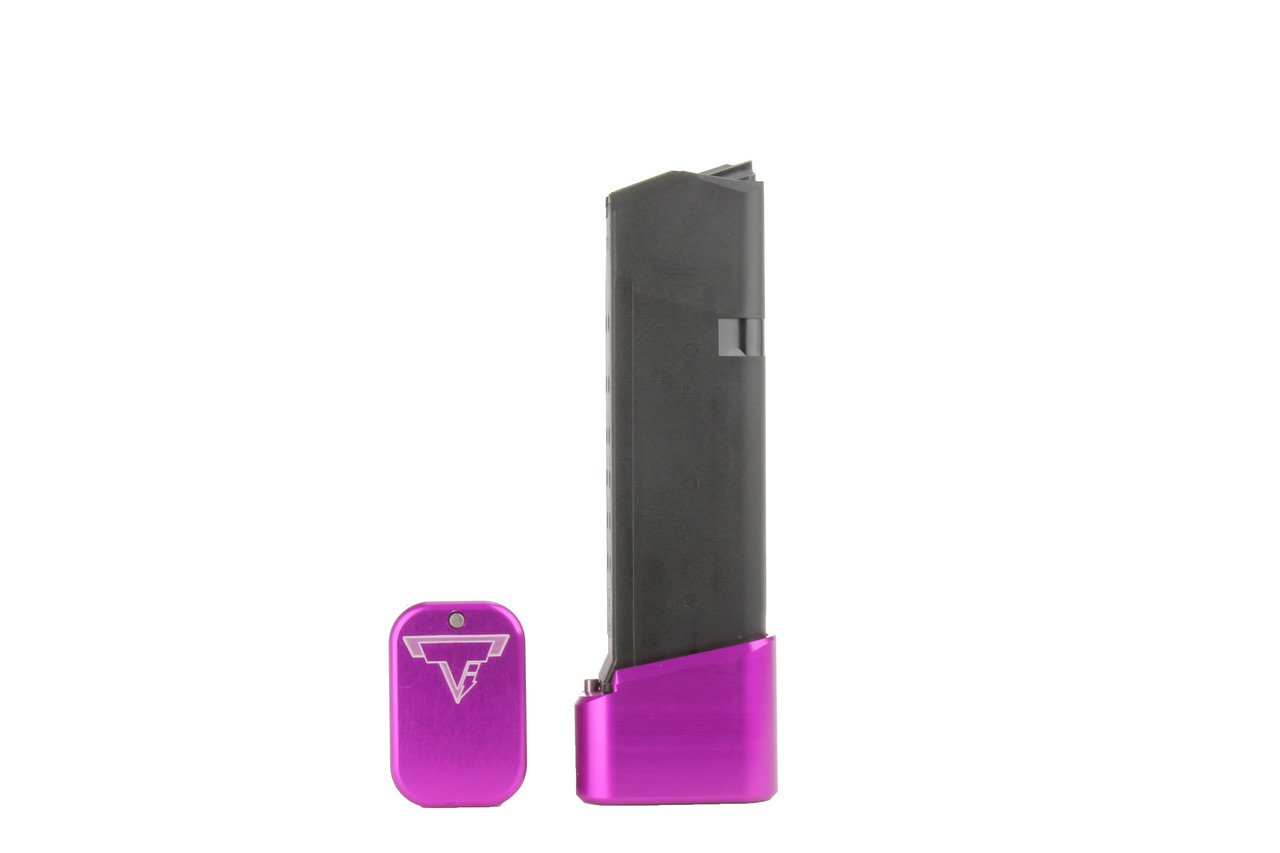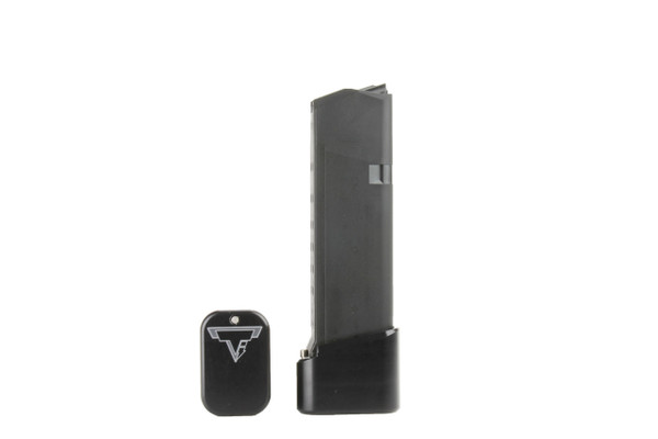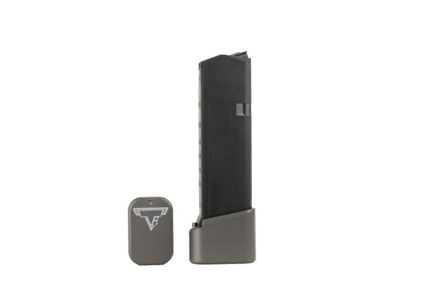 The Taran Tactical Innovations GLOCK +2/3 base pad works on GLOCK models 19/23. This base pad will add 3 extra rounds in 9mm and 2 extra rounds in 40 Caliber to the magazine. This base pad does add a little extra weight to the magazine which helps the empty mag drop free easier for faster reloads. This TTI GLOCK base pad, just like all of our base pads, is designed to give you the edge over your adversaries. We use our patented push pin design to lock the base pad to the magazine, which makes for easy field stripping and cleaning your magazines between stages. Just push down the pin, slide the base pad onto the magazine and push the pin up to lock the base pad onto the magazine. Our one piece design is great because there are no extra parts or tools needed to attach the base pad to your magazine. The base pad itself is machined out of billet aluminum and is hard anodized to ensure durable long lasting color. All machining and manufacturing is done in the USA.