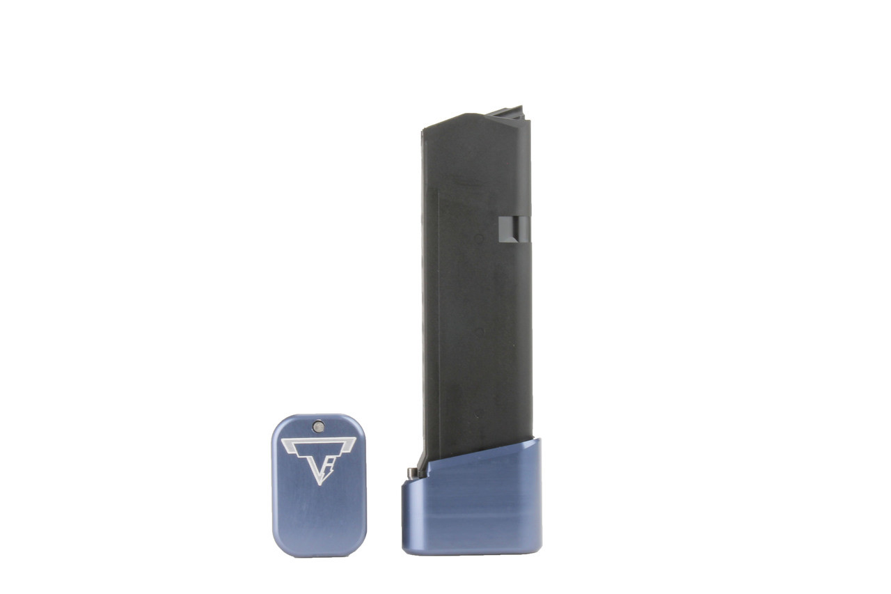 The Taran Tactical Innovations GLOCK +4/5 base pad works on GLOCK models 19/23. This base pad will add 5 extra rounds in 9mm and 4 extra rounds in 40 Caliber to the magazine. This base pad does add a little extra weight to the magazine which helps the empty mag drop free easier for faster reloads. This GLOCK base pad, just like all of our base pads, is designed to give you the edge over your adversaries. We use our patented push pin design to lock the base pad to the magazine, which makes for easy field stripping and cleaning your magazines between stages. Just push down the pin, slide the base pad on and push the pin up to lock the base pad onto the magazine. Our one piece design is great because there are no extra parts or tools needed to attach the base pad to your magazine. The base pad itself is machined out of billet aluminum and is hard anodized to ensure durable long lasting color. All machining and manufacturing is done in the USA.