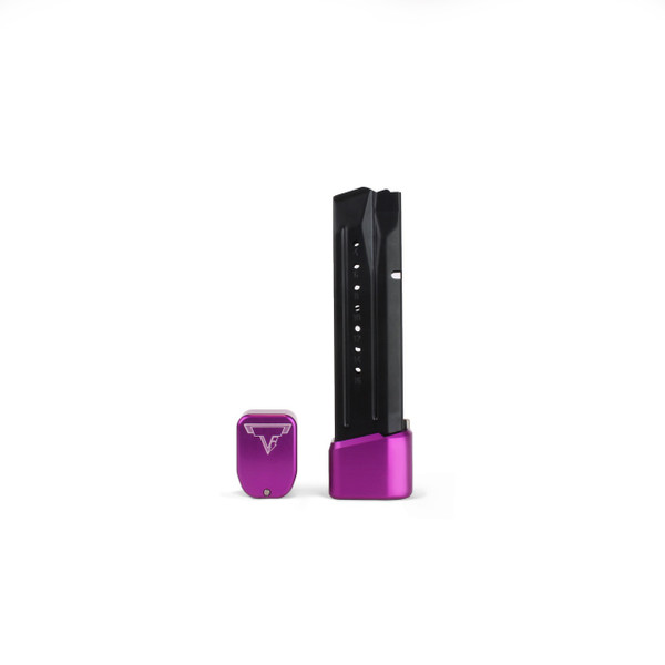 This Taran Tactical Innovations M&P base pad works on any full sized M&P handgun. This TTI base pad does add a little extra weight to the magazine which helps the empty mag drop free easier for faster reloads. This TTI M&P base pad, just like all of our base pads, is designed to give you the edge over your adversaries. We use our patented push pin design to lock the base pad to the magazine, which makes for easy field stripping and cleaning your magazines between stages. Just push down the pin, slide the base pad on and push the pin up to lock the base pad onto the magazine. Our one piece design is great because there are no extra parts or tools needed to attach the base pad to your magazine. The base pad itself is machined out of billet aluminum and is hard anodized to ensure durable long lasting color. All machining and manufacturing is done in the USA.