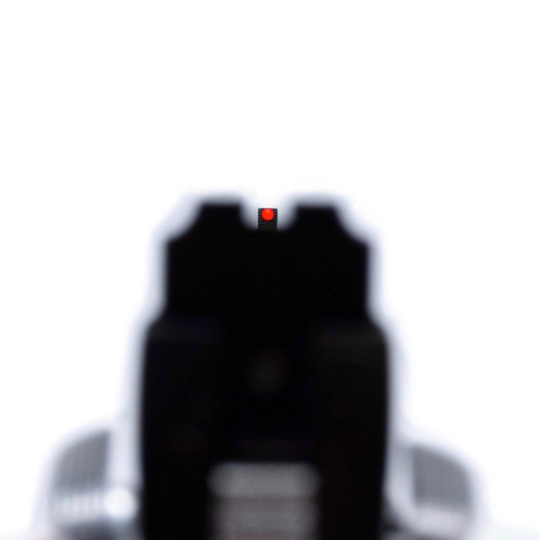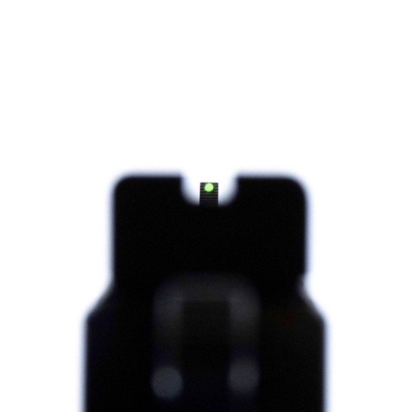 - The fiber optic dot has been moved up to the very top of the front sight so that the shooter will not get confused with shooting off the top of the dot or a big/thick blade sitting above it - Which can cause the shooter to shoot either too high or too low.