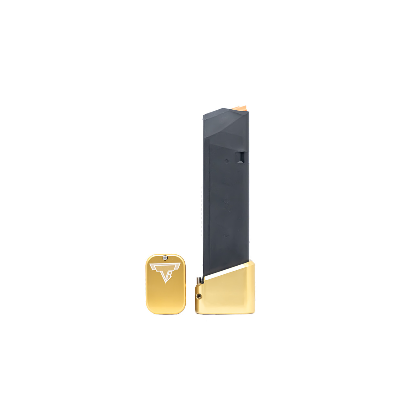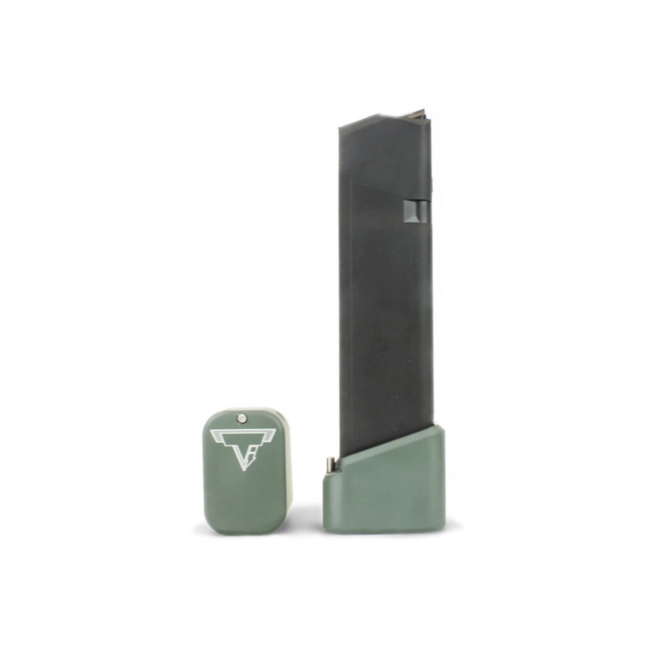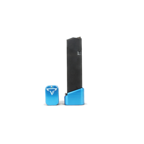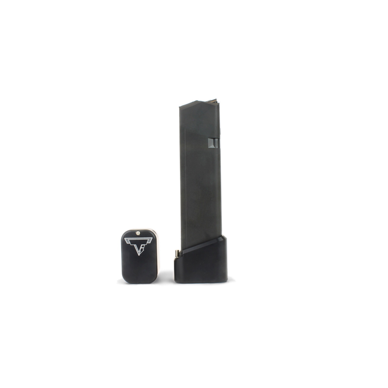 *The Taran Tactical Innovations GLOCK +5/6 base pad works on GLOCK models 17/17L/19X/22/24/34/35/45 9mm.* This base pad will add 6 extra rounds in 9mm and 5 extra rounds in 40 Caliber to the magazine. This base pad does add a little extra weight to the magazine which helps the empty mag drop free easier for faster reloads. This GLOCK base pad, just like all of our base pads, is designed to give you the edge over your adversaries. We use our patented push pin design to lock the base pad to the magazine, which makes for easy field stripping and cleaning your magazines between stages. Just push down the pin, slide the base pad on and push the pin up to lock the base pad onto the magazine. Our one piece design is great because there are no extra parts or tools needed to attach the base pad to your magazine. The base pad itself is machined out of billet aluminum and is hard anodized to ensure durable long lasting color. All machining and manufacturing is done in the USA.