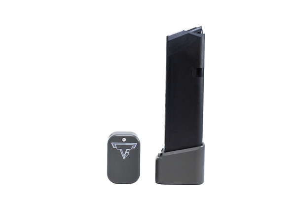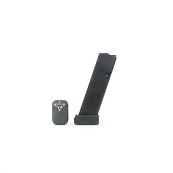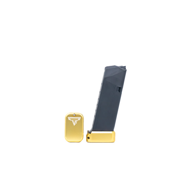 The Taran Tactical Innovations GLOCK +2/3 base pad works on GLOCK models 19/23. This base pad will add 3 extra rounds in 9mm and 2 extra rounds in 40 Caliber to the magazine. This base pad does add a little extra weight to the magazine which helps the empty mag drop free easier for faster reloads. This TTI GLOCK base pad, just like all of our base pads, is designed to give you the edge over your adversaries. We use our patented push pin design to lock the base pad to the magazine, which makes for easy field stripping and cleaning your magazines between stages. Just push down the pin, slide the base pad onto the magazine and push the pin up to lock the base pad onto the magazine. Our one piece design is great because there are no extra parts or tools needed to attach the base pad to your magazine. The base pad itself is machined out of billet aluminum and is hard anodized to ensure durable long lasting color. All machining and manufacturing is done in the USA.