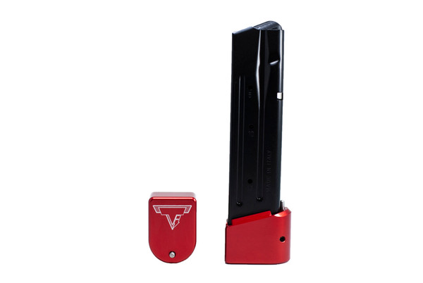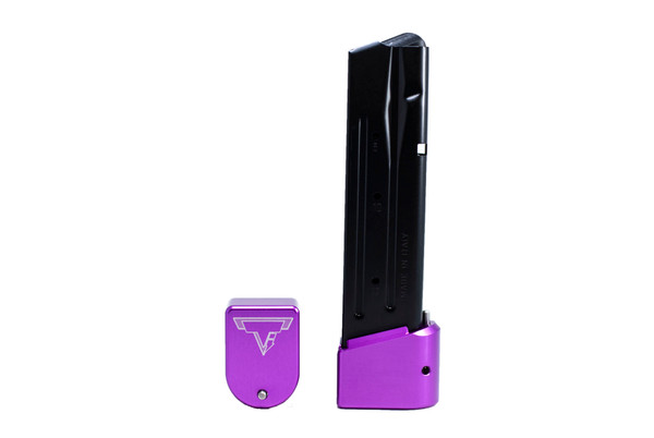 This TTI base pad does add a little extra weight to the magazine which helps the empty mag drop free easier for faster reloads. This TTI SIG base pad, just like all of our base pads, is designed to give you the edge over your adversaries. We use our patented push pin design to lock the base pad to the magazine, which makes for easy field stripping and cleaning your magazines between stages. Just push down the pin, slide the base pad onto the magazine and push the pin up to lock the base pad onto the magazine. Our one piece design is great because there are no extra parts or tools needed to attach the base pad to your magazine. The base pad itself is machined out of billet aluminum and is hard anodized to ensure durable long lasting color. All machining and manufacturing is done in the USA.