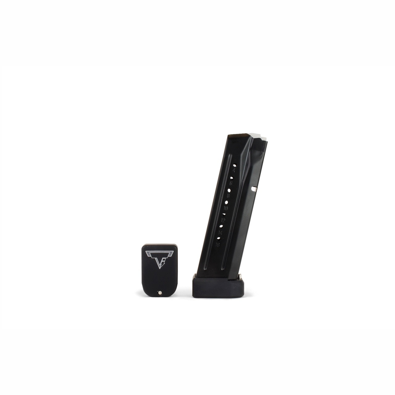 This Taran Tactical Innovations M&P base pad works on any full sized M&P handgun. This TTI base pad does add a little extra weight to the magazine which helps the empty mag drop free easier for faster reloads. This TTI M&P base pad, just like all of our base pads, is designed to give you the edge over your adversaries. We use our patented push pin design to lock the base pad to the magazine, which makes for easy field stripping and cleaning your magazines between stages. Just push down the pin, slide the base pad on and push the pin up to lock the base pad onto the magazine. Our one piece design is great because there are no extra parts or tools needed to attach the base pad to your magazine. The base pad itself is machined out of billet aluminum and is hard anodized to ensure durable long lasting color. All machining and manufacturing is done in the USA.
