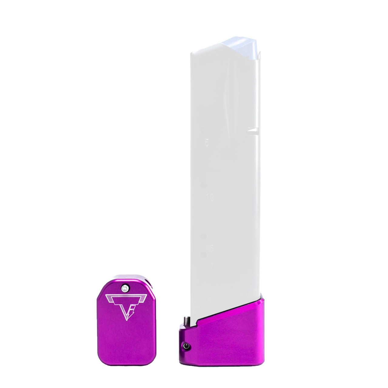The Taran Tactical Innovations CZ base pad adds 4 extra rounds to the CZ 17/18 round magazines, making the 17/18 round Mec-Gar magazines capable of holding 21 rounds in the magazine and 1 in the chamber. The TTI CZ base pad, just like all of our base pads are designed to give you the edge over your adversaries. We use our patented push pin design to lock the base pad to the magazine, which makes for easy field stripping and cleaning between stages. Just push the down the pin, slide the base pad onto the magazine and push the pin up to lock the base pad onto the magazine. Our one piece design is great because there are no extra parts or tools needed to attach the base pad to your magazine. The base pad itself is machined out of billet aluminum and is hard anodized to ensure durable long lasting color. All machining and manufacturing is done in the USA.