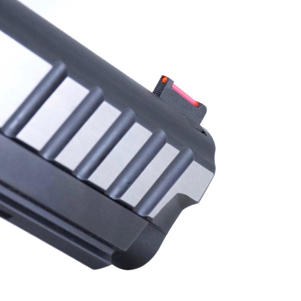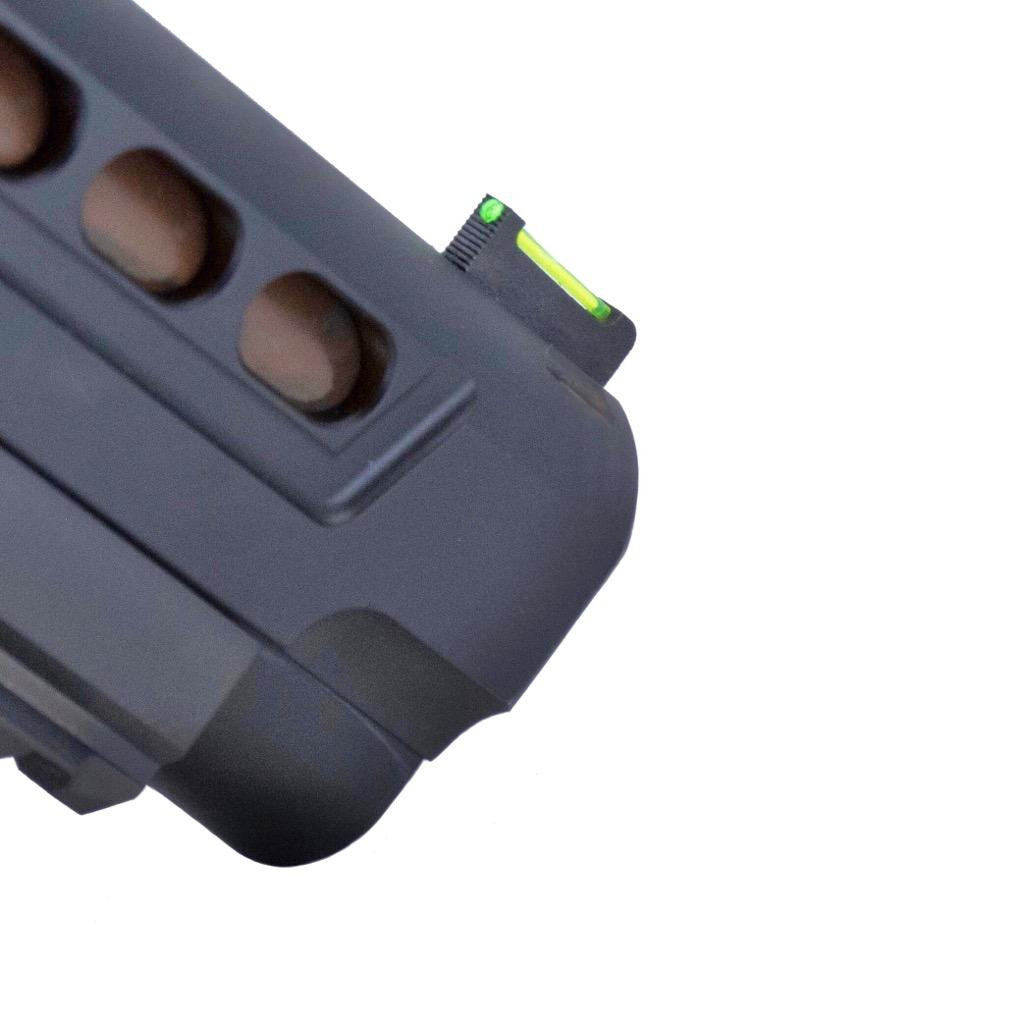 - The fiber optic dot has been moved up to the very top of the front sight so that the shooter will not get confused with shooting off the top of the dot or a big/thick blade sitting above it - Which can cause the shooter to shoot either too high or too low.